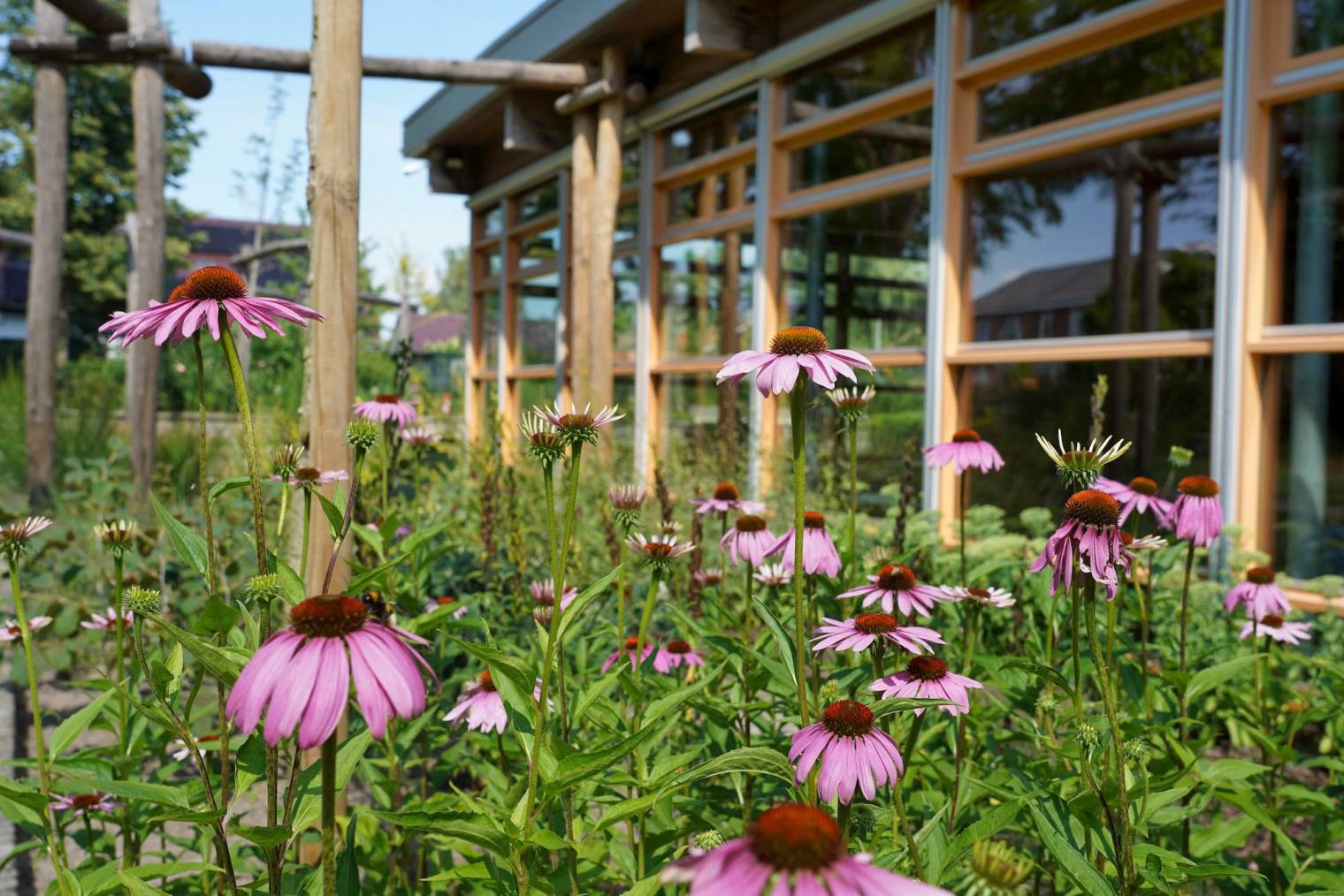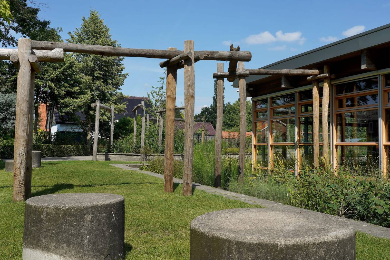 Zie je die plantenbakken? We hebben ze gemaakt met de tegels die uit het plein kwamen. Dat is pas circulair! Op het randje kunnen leerlingen trouwens lekker zitten. En die pergola’s van Robinia-hout? Die staan niet alleen mooi te zijn: door de uitgeholde bovenbalken loopt regenwater naar de wadi, waar het langzaam wegzakt in de bodem. Door deze natuurlijke waterberging konden we alle kolken verwijderen.