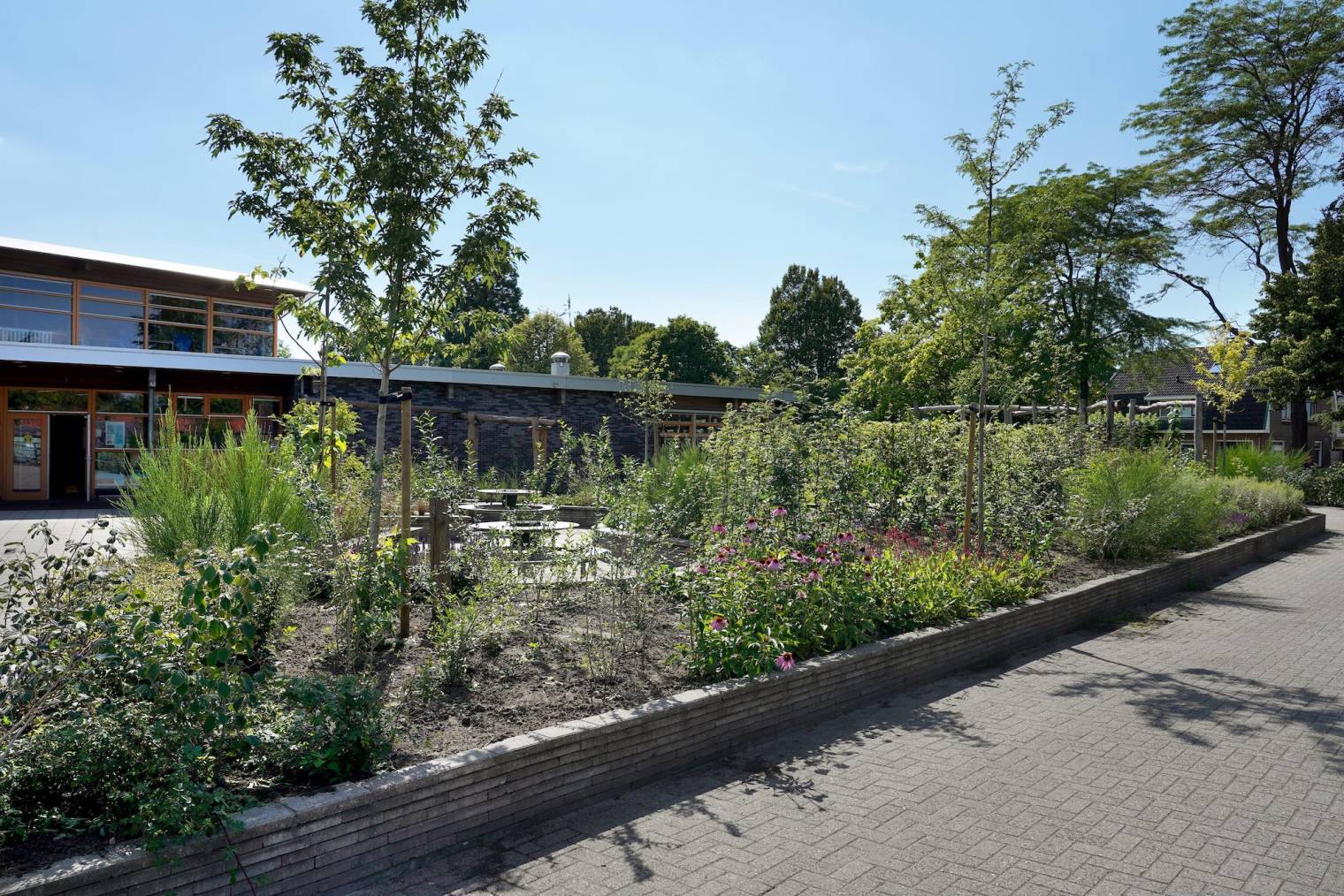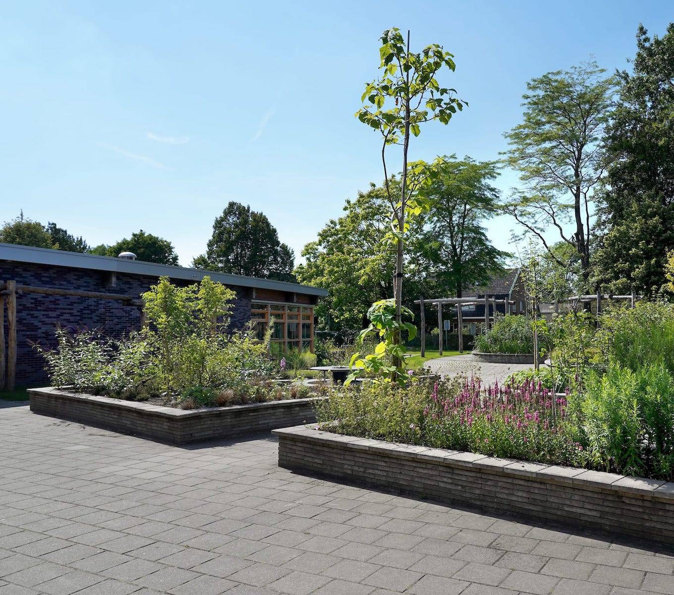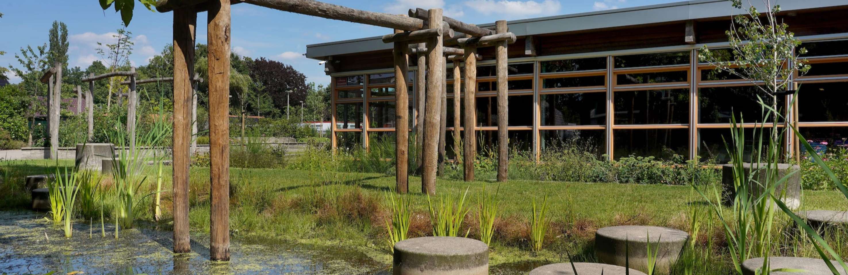 Het nieuwe schoolplein is niet alleen een stuk groener, maar ook veel spannender. Met verhoogde borders en bomen zijn hoogteverschillen gecreëerd, waardoor je nu overal sfeervolle zitjes en hoekjes hebt. Grote keien, bloeiende planten, fruitbomen en een vijver met stapstenen geven het terrein een natuurlijke look.