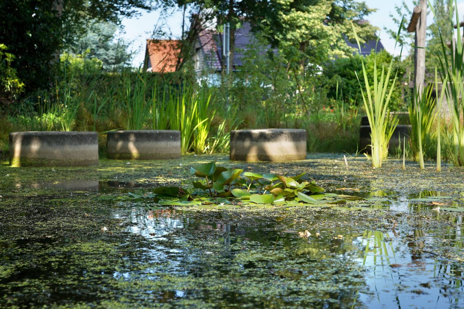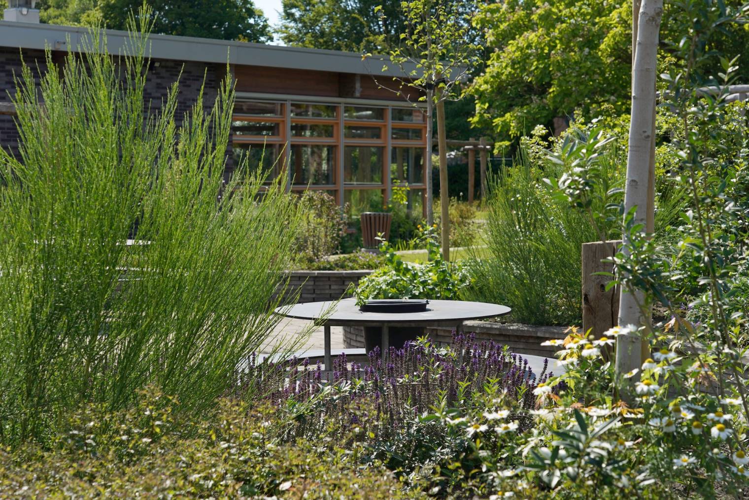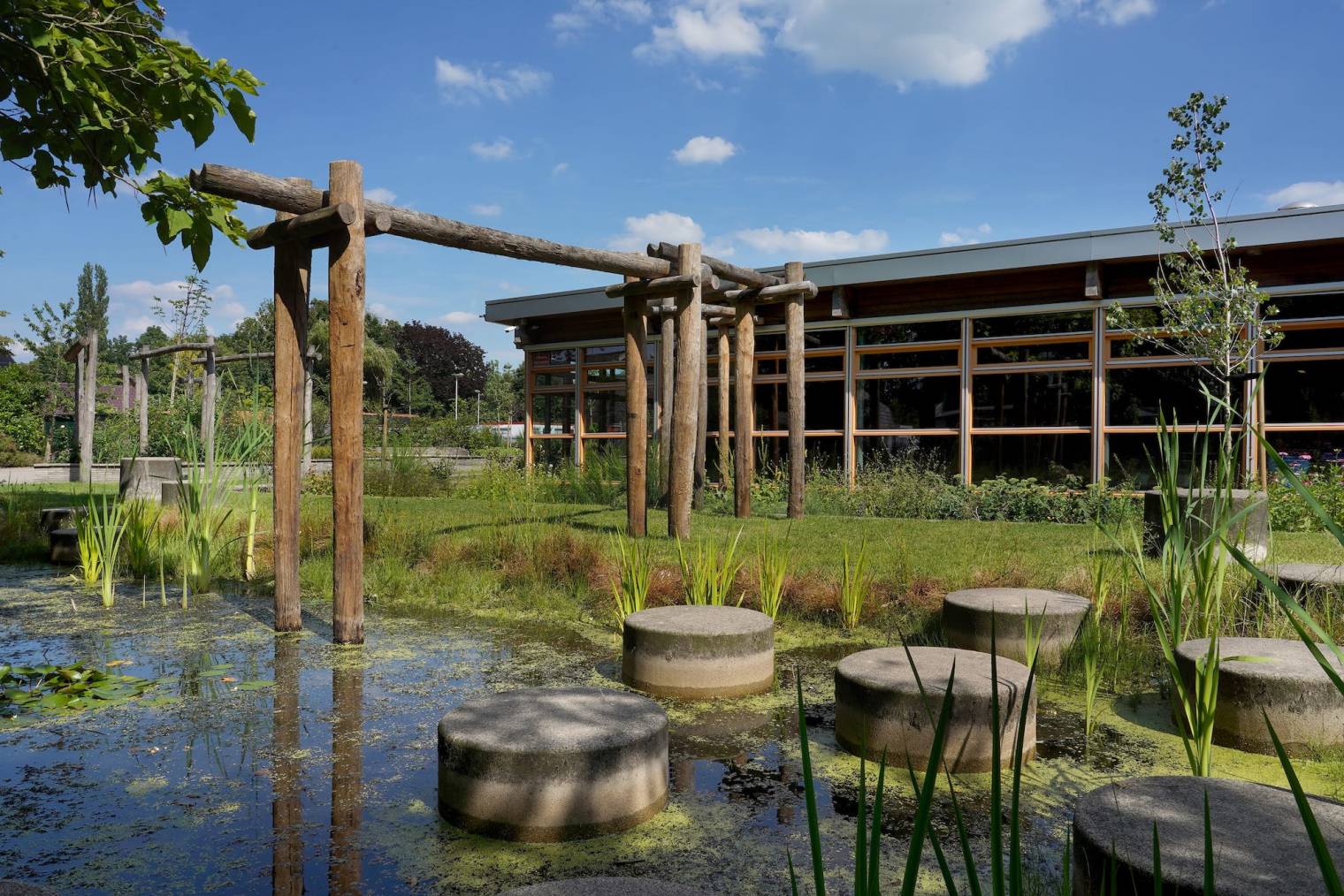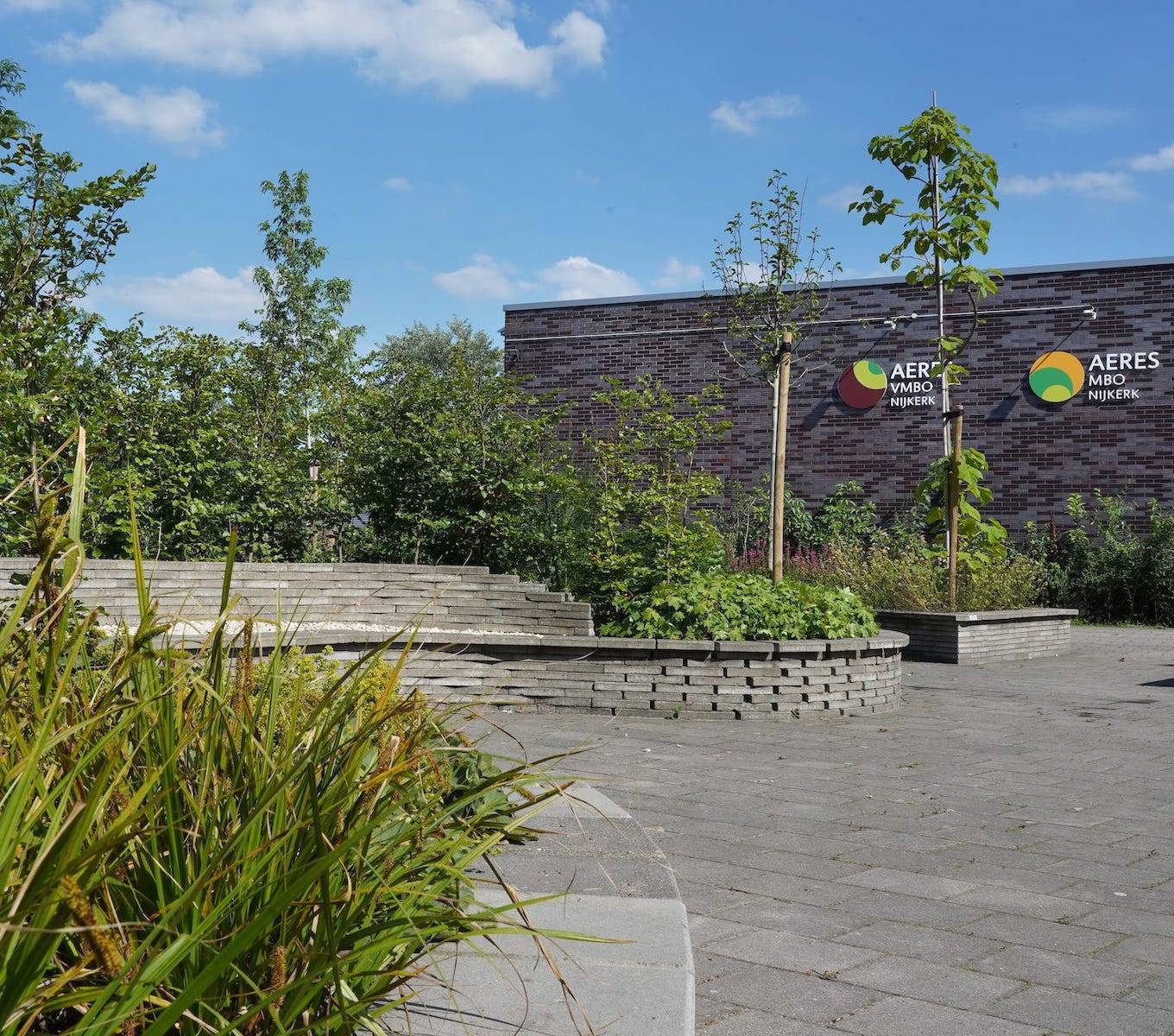 Het nieuwe schoolplein is niet alleen een stuk groener, maar ook veel spannender. Met verhoogde borders en bomen zijn hoogteverschillen gecreëerd, waardoor je nu overal sfeervolle zitjes en hoekjes hebt. Grote keien, bloeiende planten, fruitbomen en een vijver met stapstenen geven het terrein een natuurlijke look.
